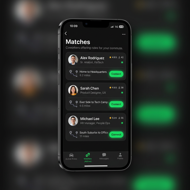 Enter your workplace and see verified colleagues offering seats on the same route. Filter by time, price, and rating.