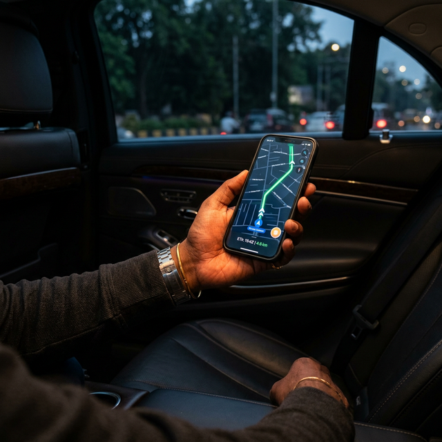 During any active ride, passengers can share their live GPS location with trusted emergency contacts. The app shows the driver's real-time position on a map. An SOS button is always visible — tap it to instantly call 112 (National Emergency), 100 (Police), or share your location as a Google Maps link.